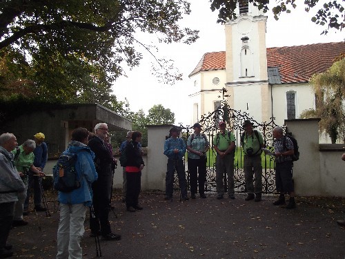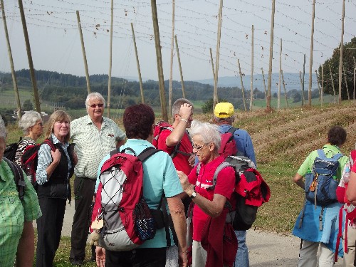 In Bodnegg musste erst einmal der Kirchberg zu Beginn der Etappe erwandert werden. Dort wurde die Pfarrkirche besichtigt. Auch heute war wieder eine große Schar an Wanderfreunden gekommen. Vom Kirchberg hatte man einen tollen Ausblick auf die Landschaft, die nun vor uns lag. Immer ein Stück näher dem vorletzten Etappenort Tettnang. Durch Obstanlagen und Hopfenplantagen führte der Weg zum Hopfenmuseum nach Siggenweiler und über die Brünensweiler Höhe in die Montfort Stadt Tettnang.