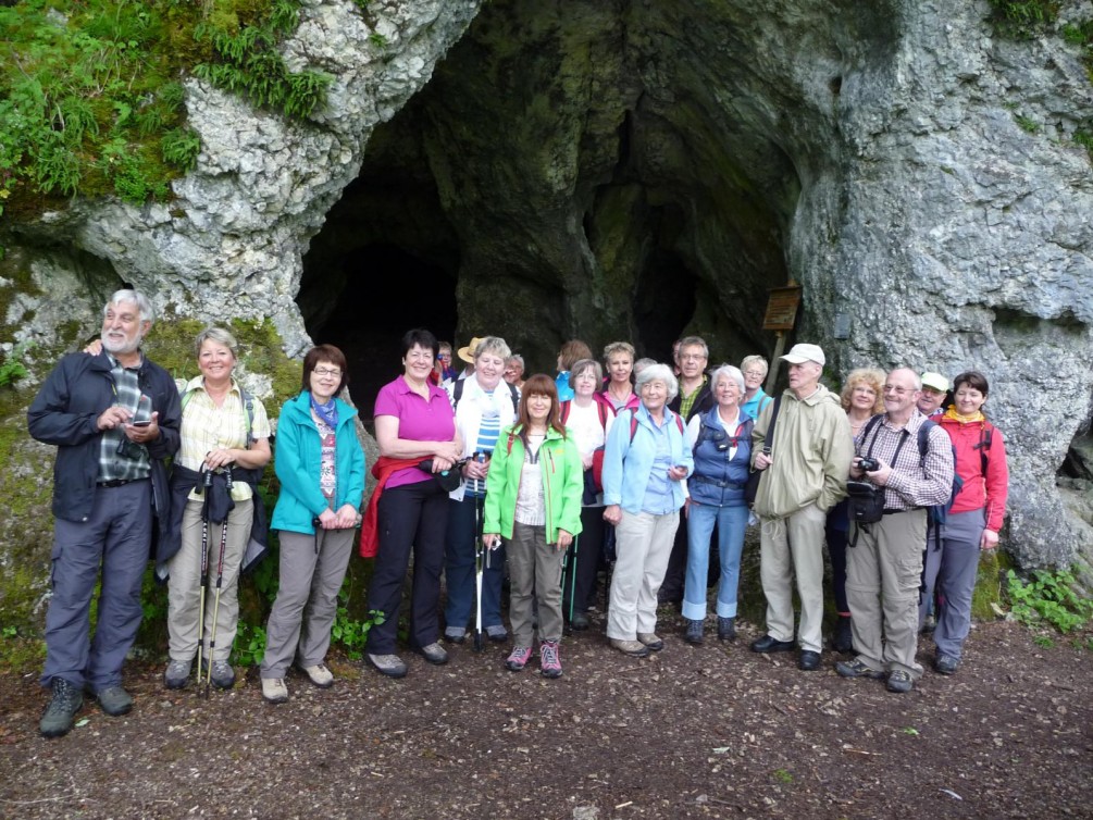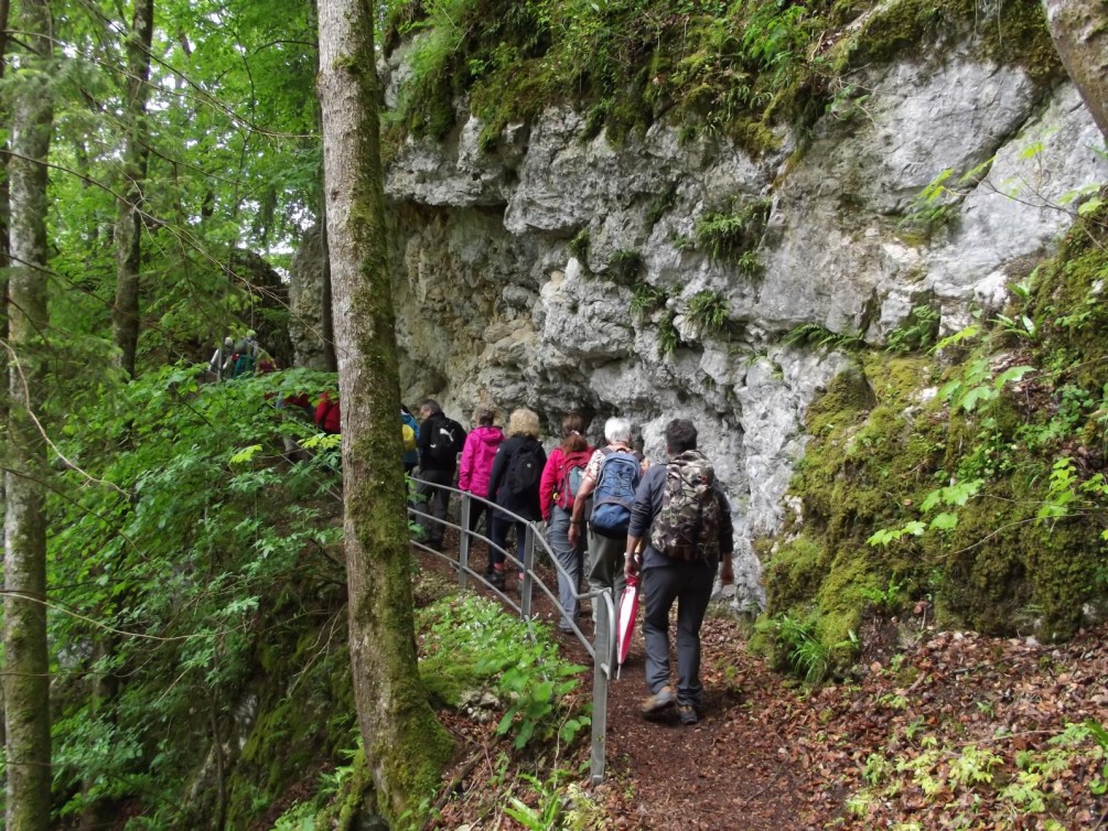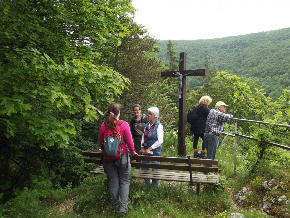 Wir überqueren die Bahnlinie am Drehkreuz, laufen ein Stück auf dem Radweg flussabwärts und steigen dann zum Maurusfelsen auf. Nach dem Abstieg erreichen wir die „Rote Brunnenhöhle“ oder auch „Maurushöhle“ genannt. Weiter geht es wieder auf dem Donauradweg, überqueren die Donau auf der neuen Brücke und wollen zur „Benediktushöhle“ aufsteigen. Leider verpassen wir den richtigen Weg und erreichen zuerst die Mauruskapelle. Nicht alle Mitwanderer steigen dann trotzdem noch zur „Benediktuskapelle“ auf und genießen den herrlichen Blick ins obere Donautal. Auf dem Tunnelweg wandern wir zurück nach Beuron. Leider erwischt uns auf dem Rückweg doch noch der Regen.